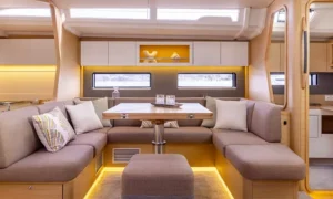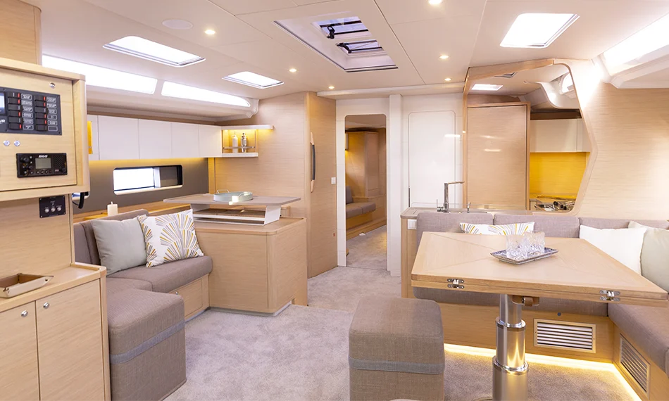 The interior saloon of the Dufour 54 is a large, comfortable space with a saloon table and plenty of seating. To make this space even more convivial, Dufour has included seats that can be moved to wherever they are needed to accommodate all the guests.