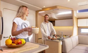 The second version of the galley is offered with the five-cabin version of the Dufour 54. It is located on the port side of the yacht and extends with a large worktop replacing the bench seat of the other version.