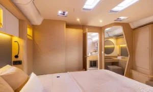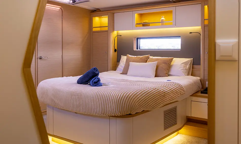 Particular emphasis has been placed on the quality of life outside, with completely redesigned spaces to fully realise your desire to get away from it all in the great outdoors. The interiors have also been designed to give you a total connection with the elements. The large windows provide a 360° view of the sea and the sky, wherever you are on the boat. Each room is bathed in a soft, warm light that makes moving around and life on board a pleasure.
