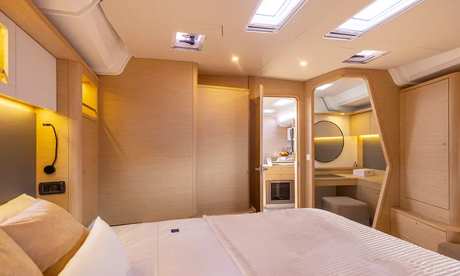 To maximize the customization options of each Dufour 54 sailing yacht, future owners can choose different modules and create their dream boat. For example, they can choose between two different bathrooms, a large storage space or a desk. At the very front of the boat, they can opt for a sail locker or a crew cabin.