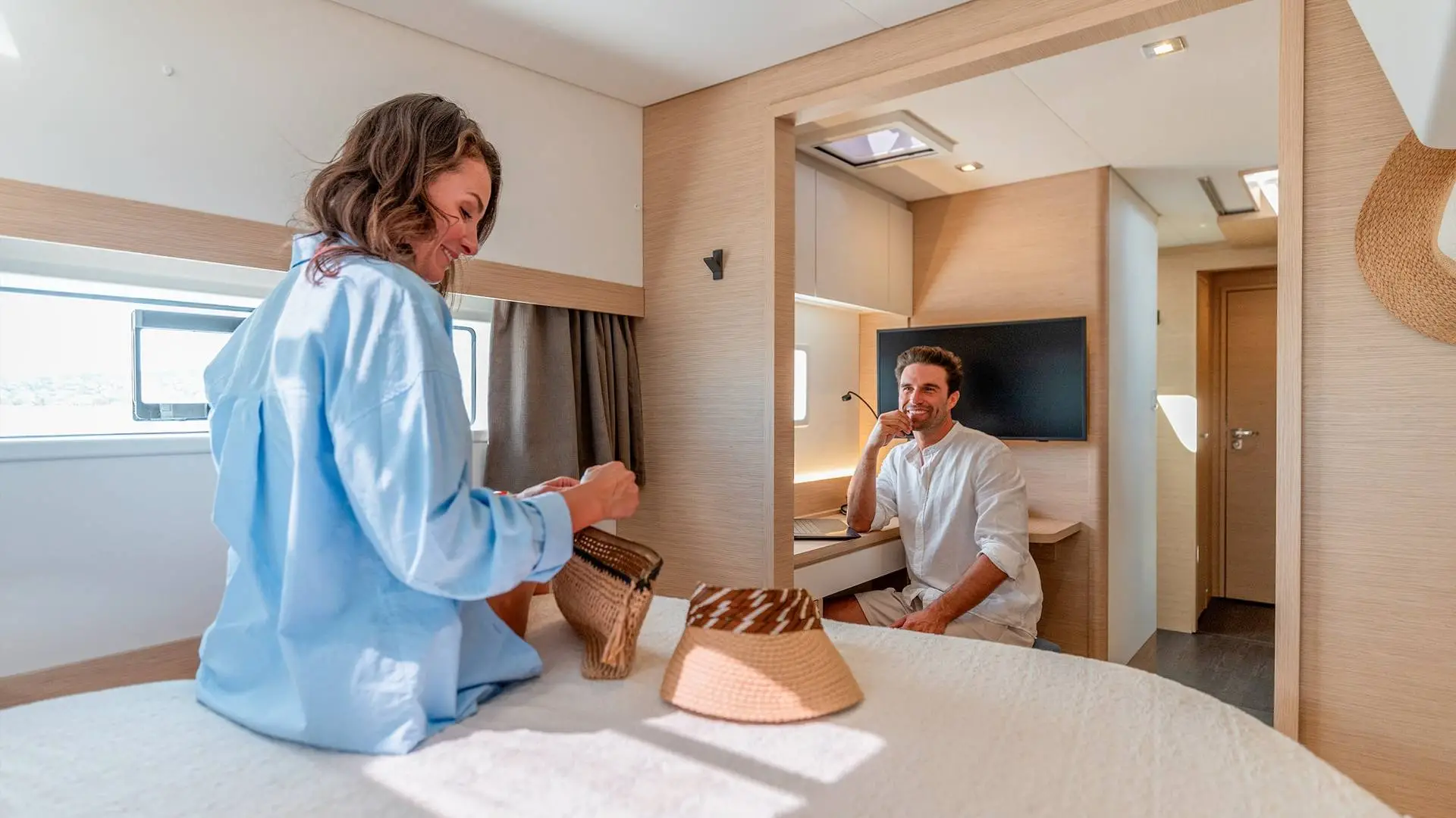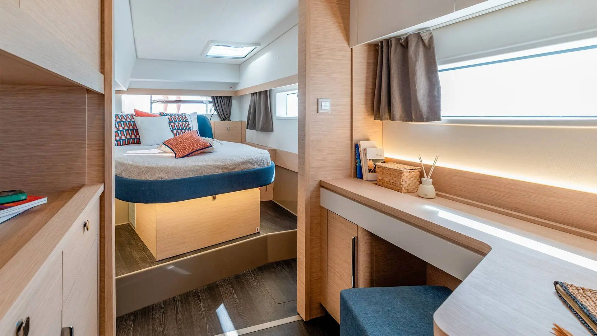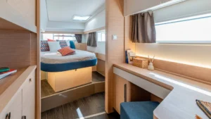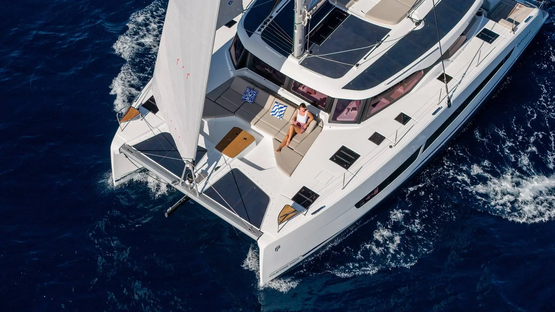 The discreet coachroof (albeit wider), the subtly inverted deck sheer, hull portholes highlighted by a stripe, a discreet chine above the waterline that’s extended as much as possible, and a sleek rig are all elements that guarantee not only good performance, but also elegance and balance. From the very first tack you make, harmony is the natural order of the day: this perfectly optimised catamaran offers generous relaxation space in the cockpit, on the flybridge and forward of the coachroof. When it comes to sail manoeuvring, the deck layout remains faithful to the double manoeuvring/helm station that’s become such a favourite among users. Like all new Fountaine Pajot models, the New 44 is available with our ODSea+ electric drivetrain and up to 2 000W of solar panels.