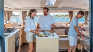 Conviviality: that’s the key word the moment you step aboard this catamaran that’s designed as a little island for living on the water. Every detail has been created by our teams to ensure that the crew share the pleasure of sailing. Offshore, the New 44 ensures safety and performance, while at anchor, she offers impeccable comfort.