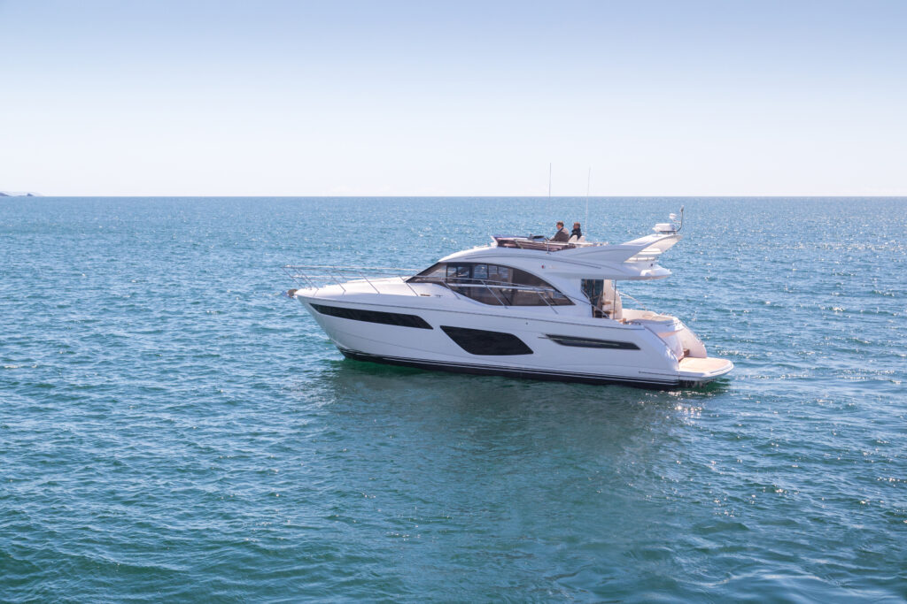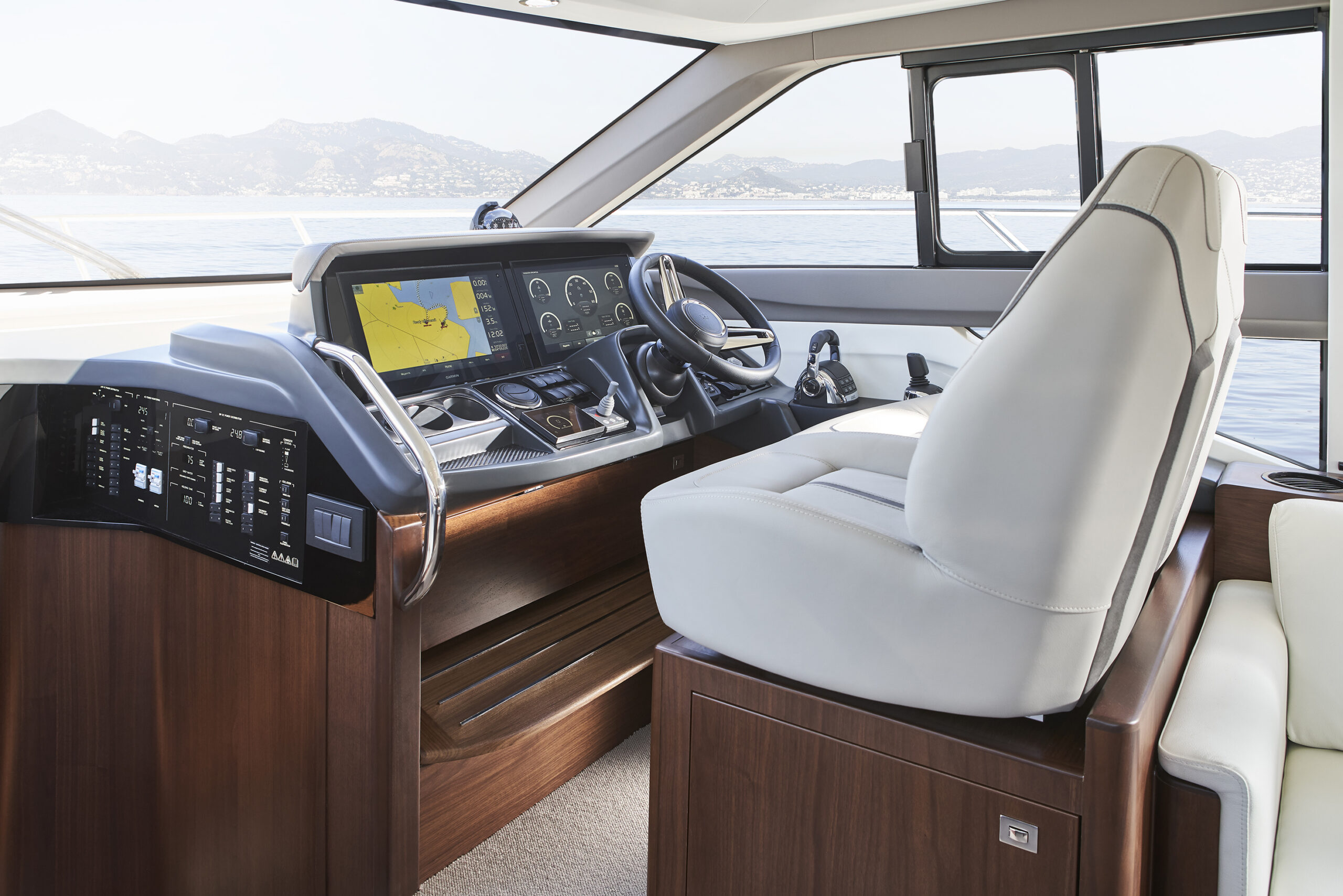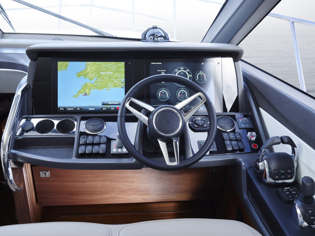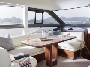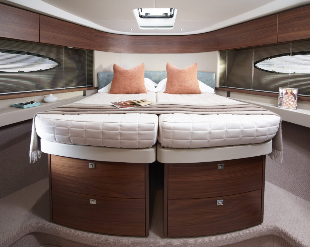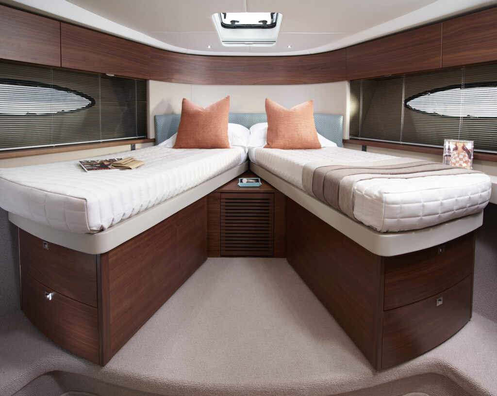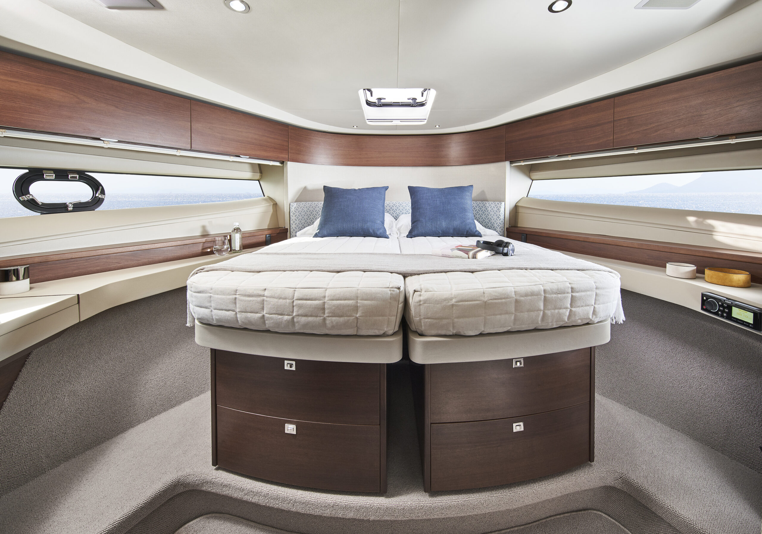 Slicing through waves at 36 knots, the new Princess F50 delivers the ultimate on-water experience for a flybridge yacht, with an extreme focus on the use of space and dynamic performance. Designed with on-deck living in mind, easy transitioning between exterior and interior invites guests to move seamlessly from indoors to out. Her saloon features a U-shaped sofa and dining table for 6 guests, which can also convert to a comfortable double berth as required, whilst her spacious foredeck boasts a luxurious sunpad, perfect for reclining and relaxing in a secluded bay. Her well-proportioned flybridge features a spacious aft U-shaped seating area, forward L-shaped seating to the portside which converts to a sunbed and twin helm seats. The dual-station instrumentation and latest Volvo-Garmin navigation and control systems enable her to be helmed from both the main deck and flybridge for precision manoeuvring. All in all, an exceptional on-water experience for a compact flybridge yacht.