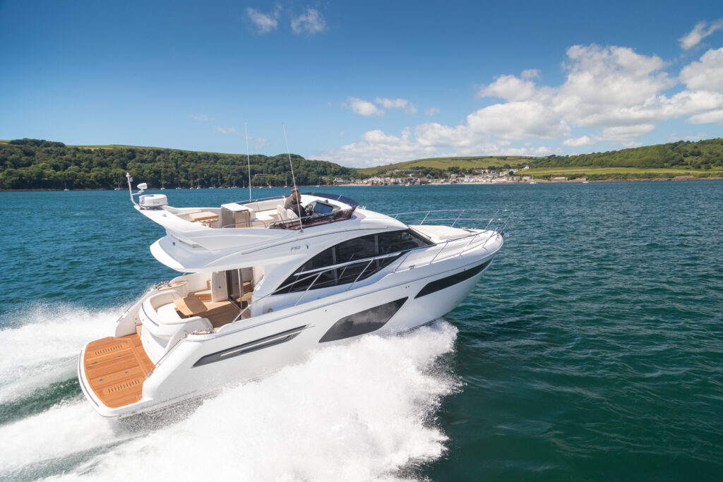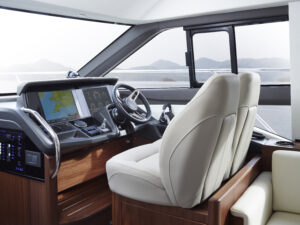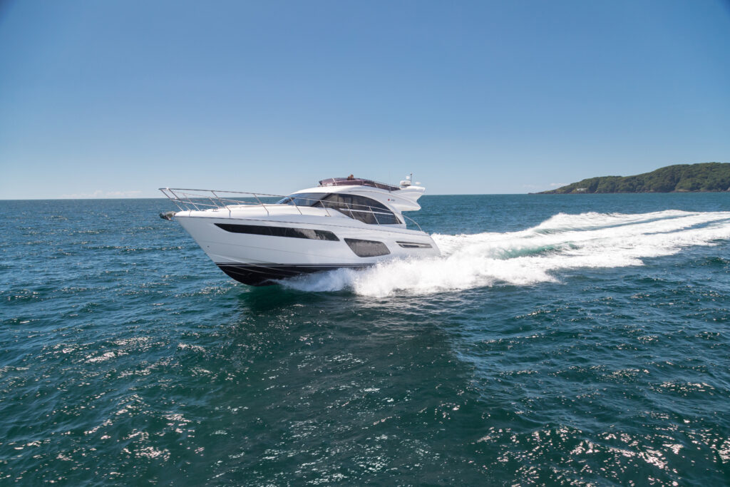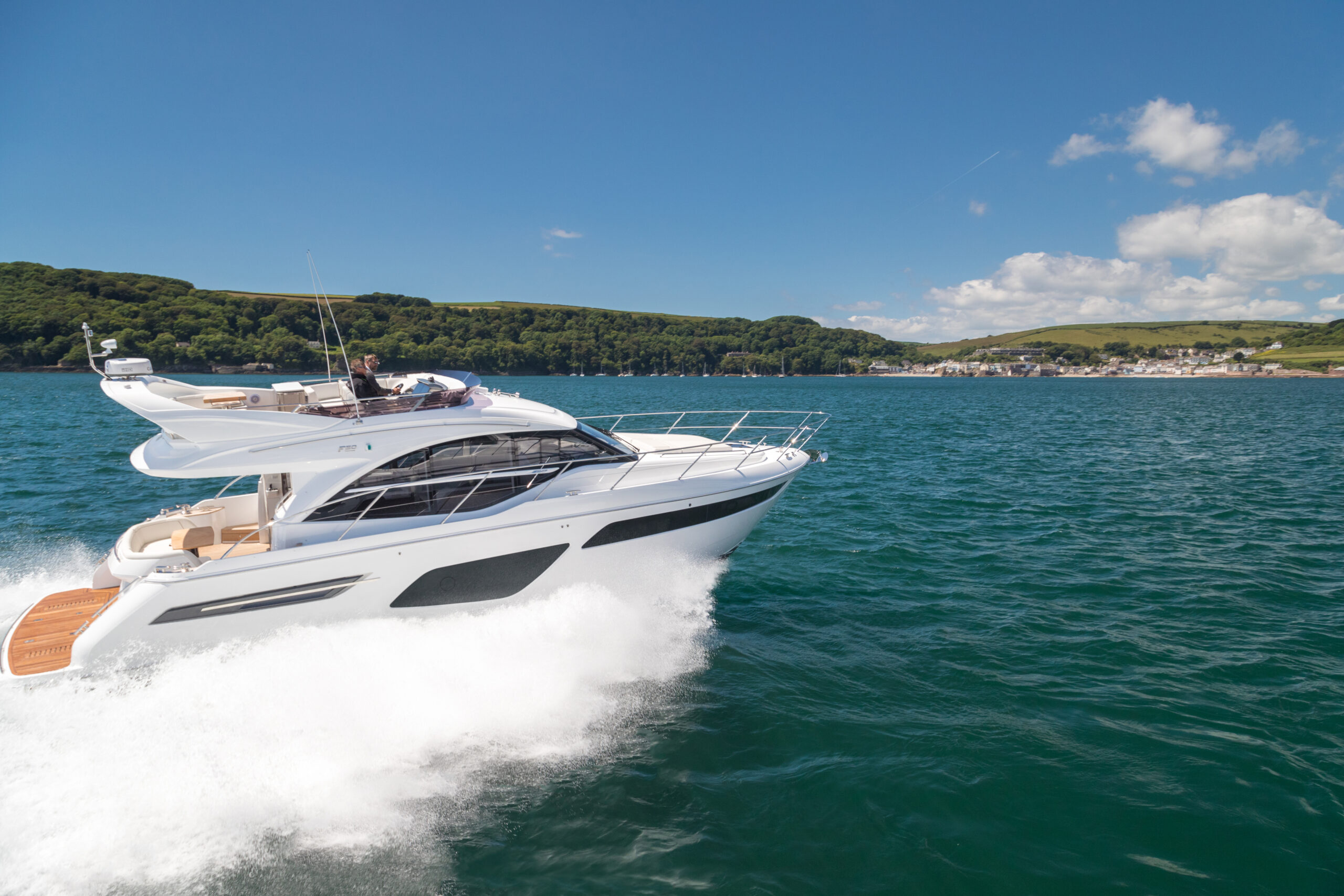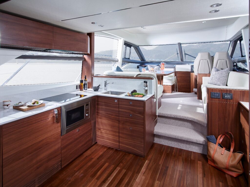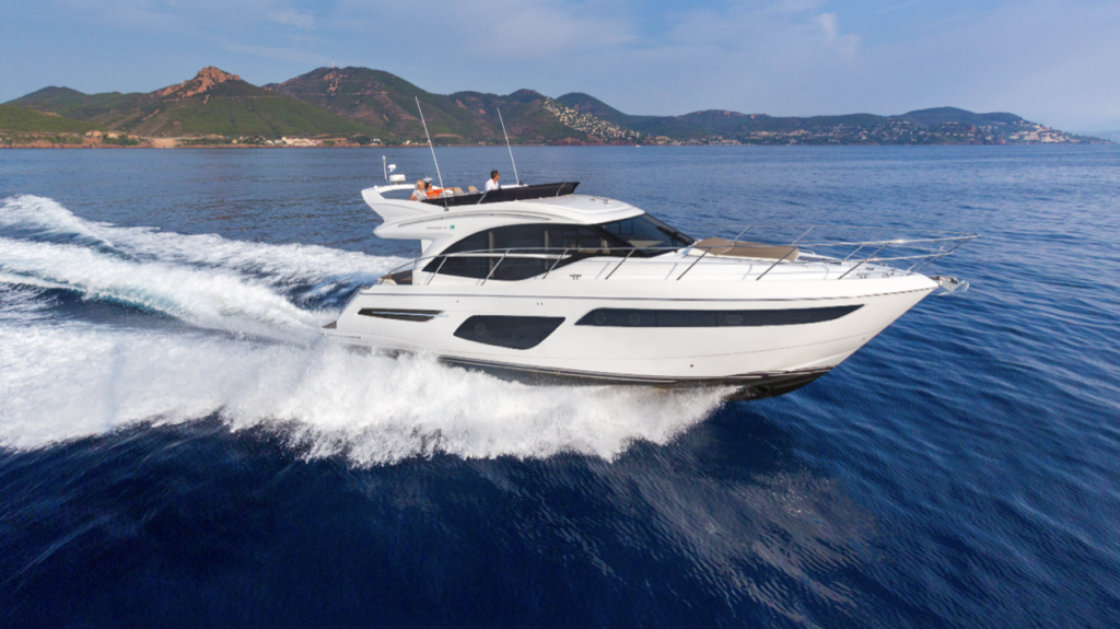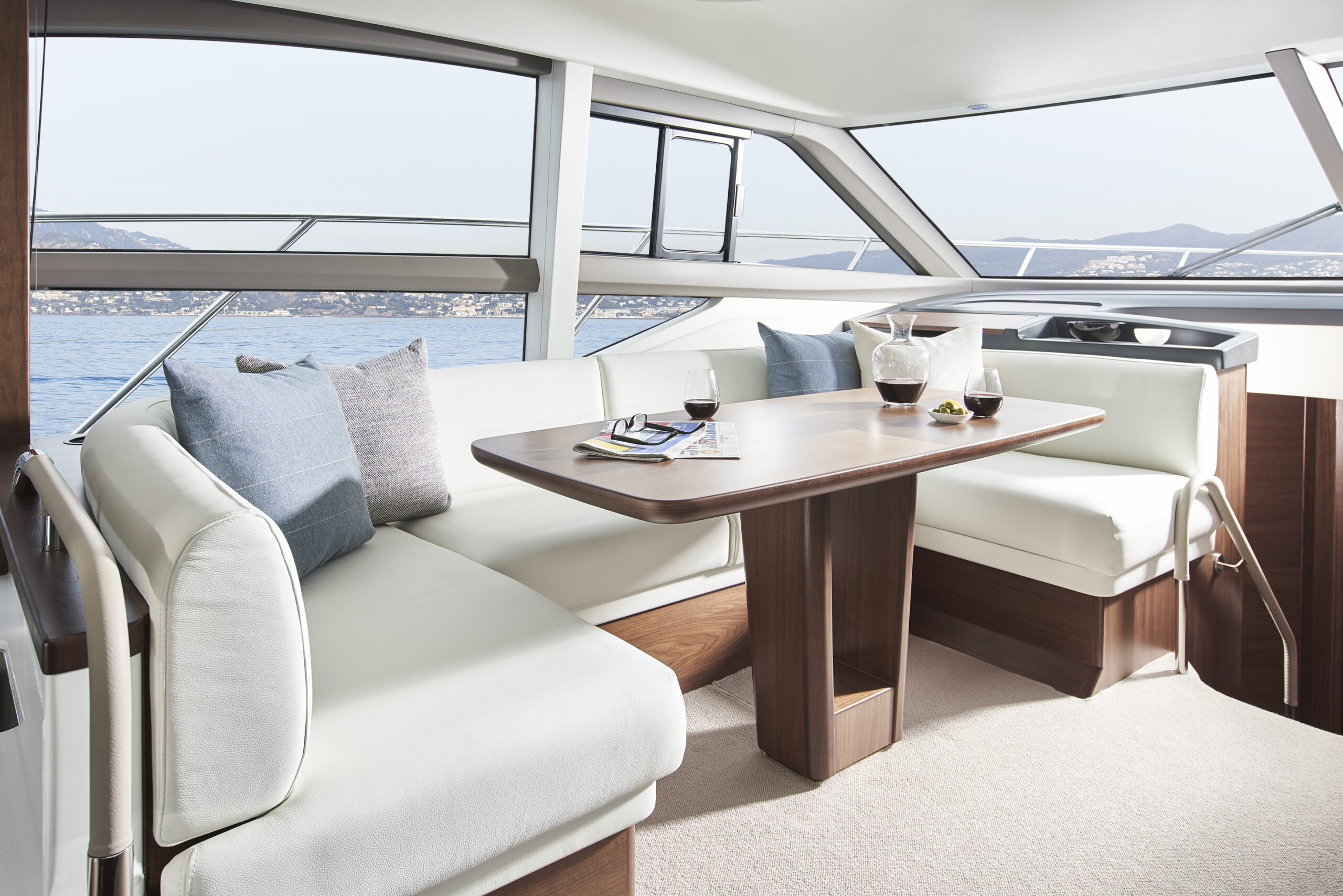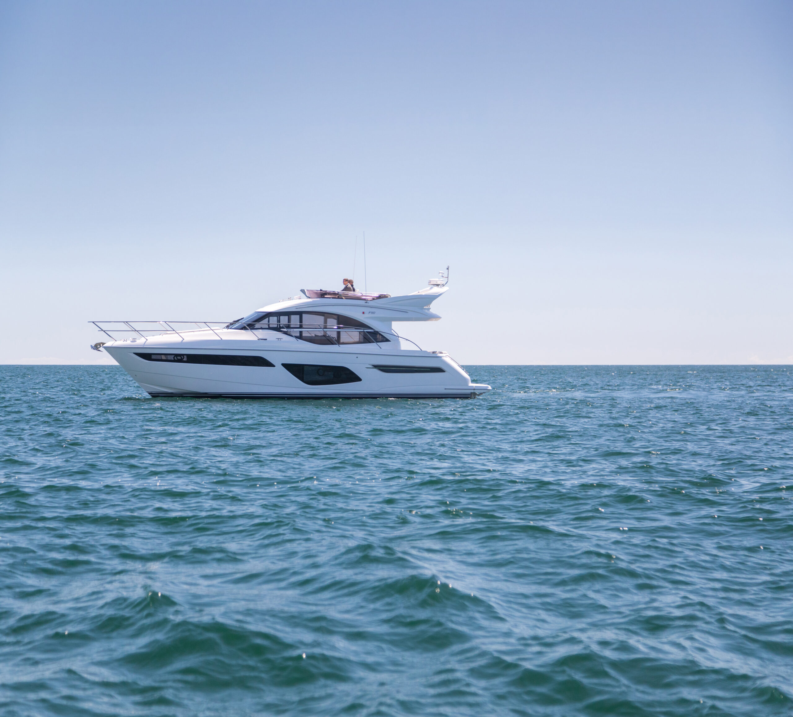 Slicing through waves at 36 knots, the new Princess F50 delivers the ultimate on-water experience for a flybridge yacht, with an extreme focus on the use of space and dynamic performance. Designed with on-deck living in mind, easy transitioning between exterior and interior invites guests to move seamlessly from indoors to out. Her saloon features a U-shaped sofa and dining table for 6 guests, which can also convert to a comfortable double berth as required, whilst her spacious foredeck boasts a luxurious sunpad, perfect for reclining and relaxing in a secluded bay. Her well-proportioned flybridge features a spacious aft U-shaped seating area, forward L-shaped seating to the portside which converts to a sunbed and twin helm seats. The dual-station instrumentation and latest Volvo-Garmin navigation and control systems enable her to be helmed from both the main deck and flybridge for precision manoeuvring. All in all, an exceptional on-water experience for a compact flybridge yacht.