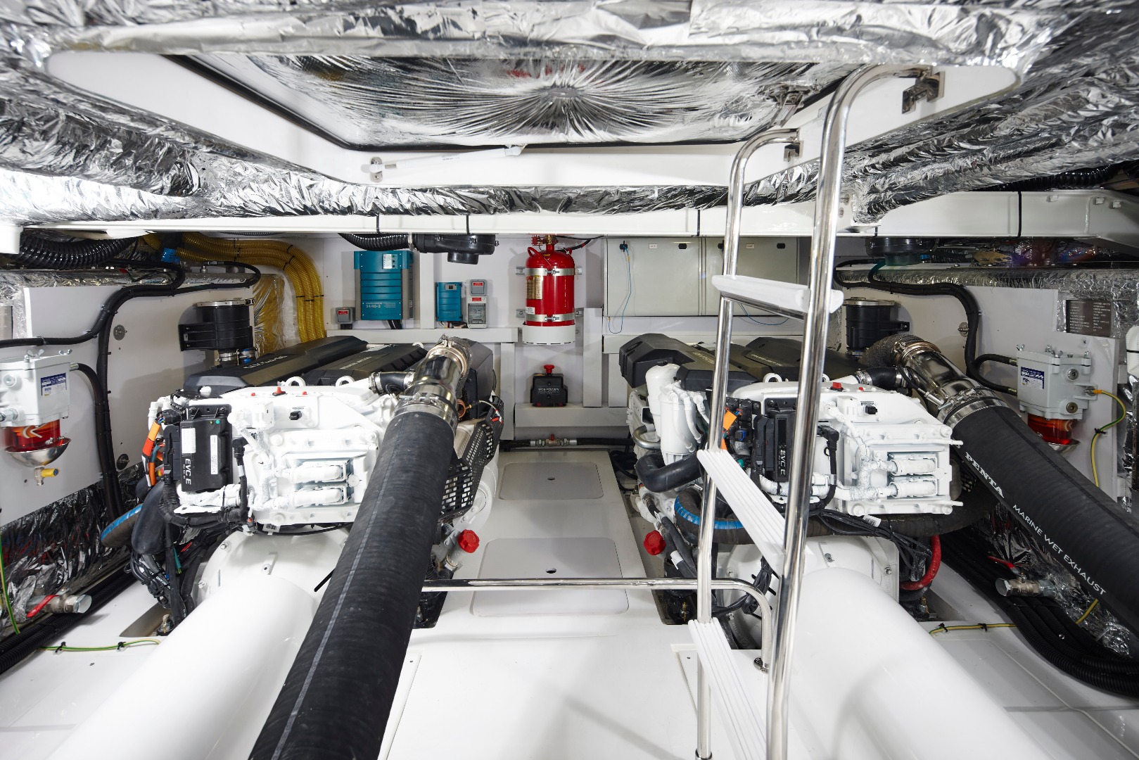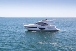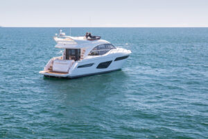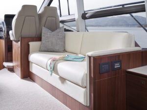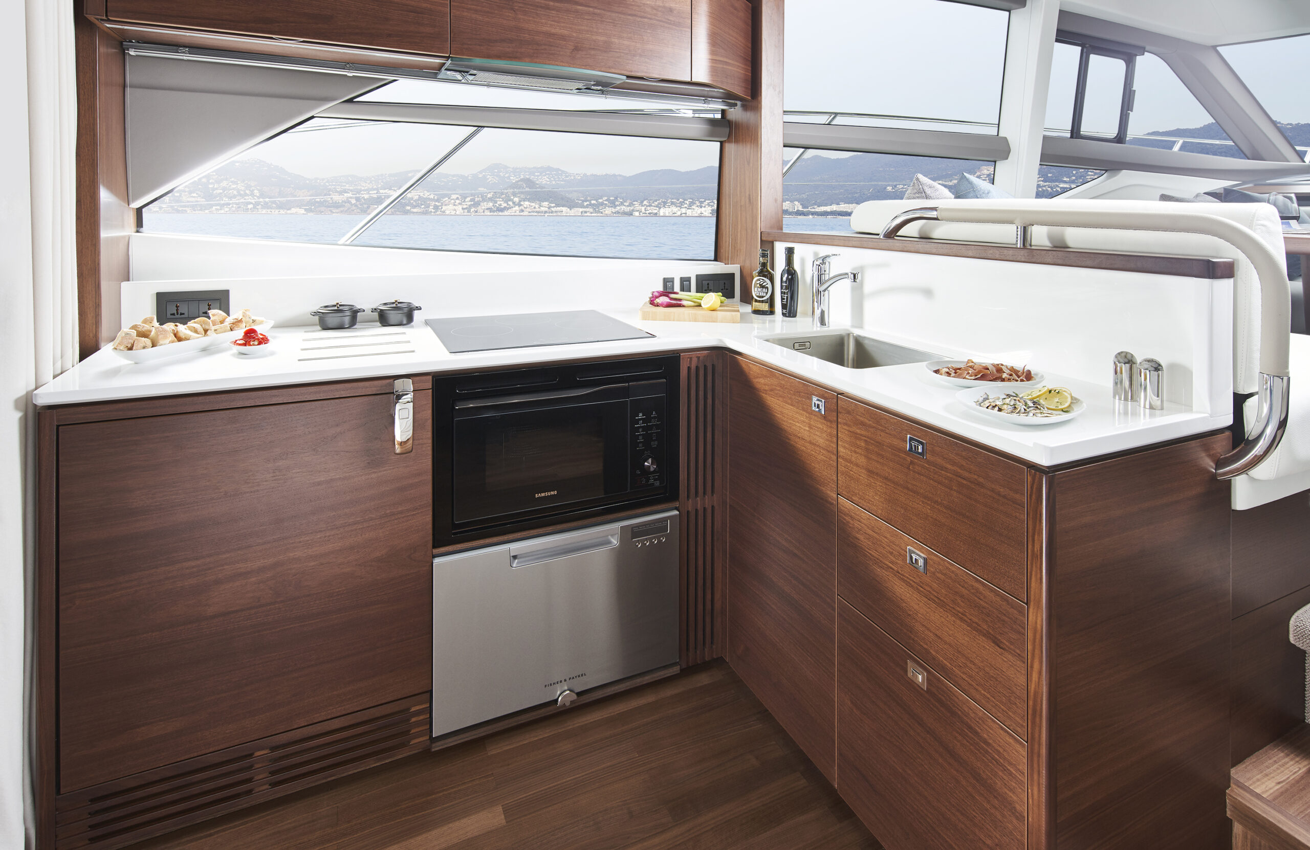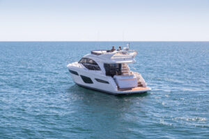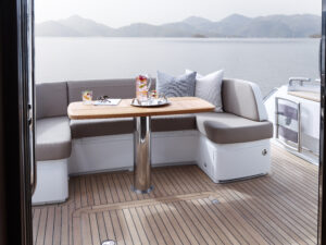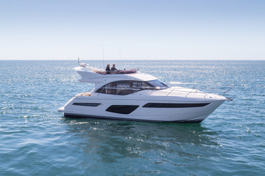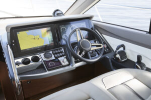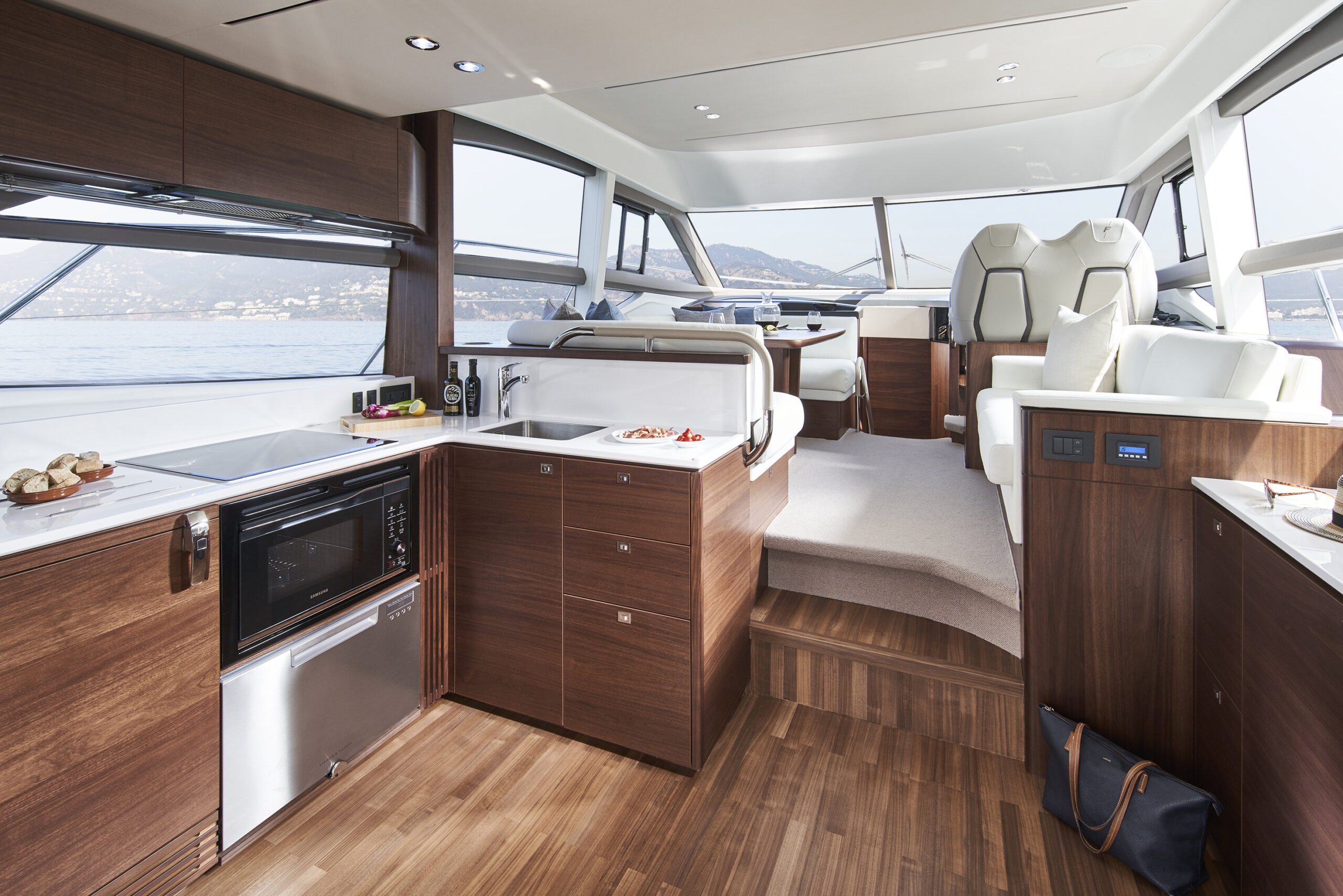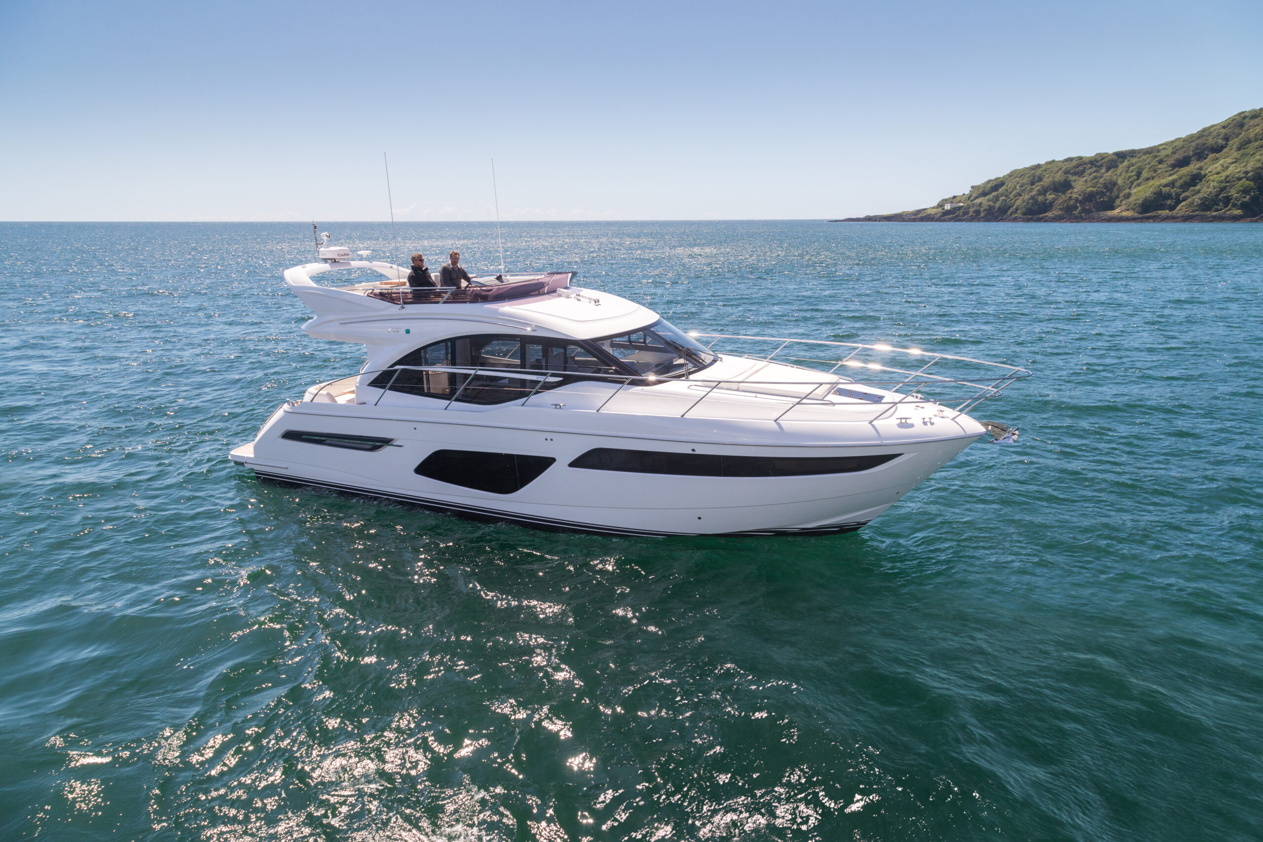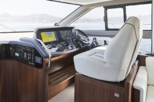 Slicing through waves at 36 knots, the new Princess F50 delivers the ultimate on-water experience for a flybridge yacht, with an extreme focus on the use of space and dynamic performance. Designed with on-deck living in mind, easy transitioning between exterior and interior invites guests to move seamlessly from indoors to out. Her saloon features a U-shaped sofa and dining table for 6 guests, which can also convert to a comfortable double berth as required, whilst her spacious foredeck boasts a luxurious sunpad, perfect for reclining and relaxing in a secluded bay. Her well-proportioned flybridge features a spacious aft U-shaped seating area, forward L-shaped seating to the portside which converts to a sunbed and twin helm seats. The dual-station instrumentation and latest Volvo-Garmin navigation and control systems enable her to be helmed from both the main deck and flybridge for precision manoeuvring. All in all, an exceptional on-water experience for a compact flybridge yacht.