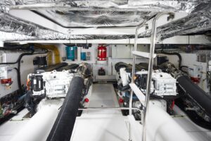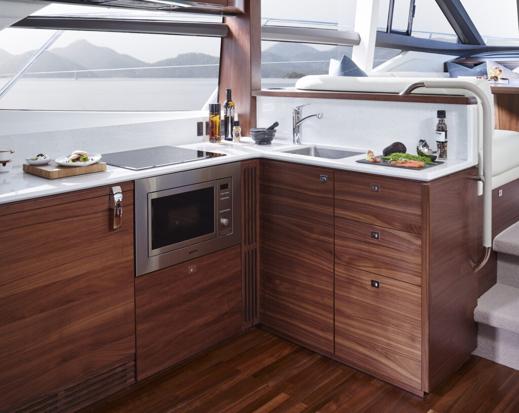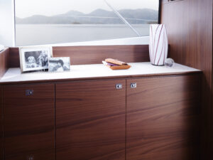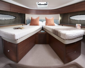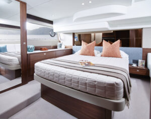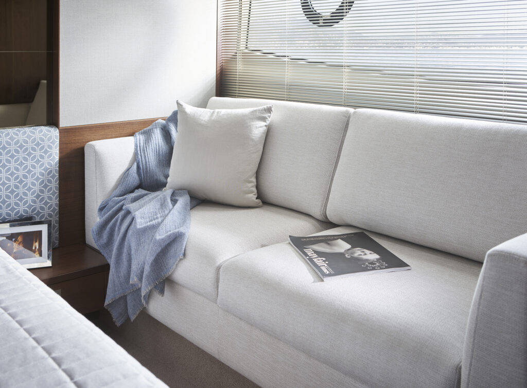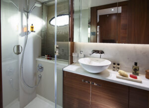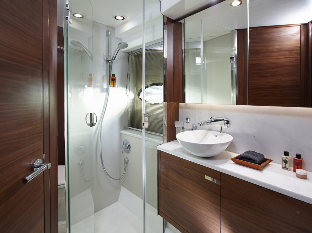 Below deck, up to six guests can enjoy three beautifully appointed, spacious cabins, two of which are en-suite. All are filled with natural light from the sweeping hull glazing. The generous full beam master stateroom features a large double bed whilst the forward stateroom has the option of scissor berths that easily convert into a double berth for added flexibility. A further twin guest cabin completes her spacious accommodation.