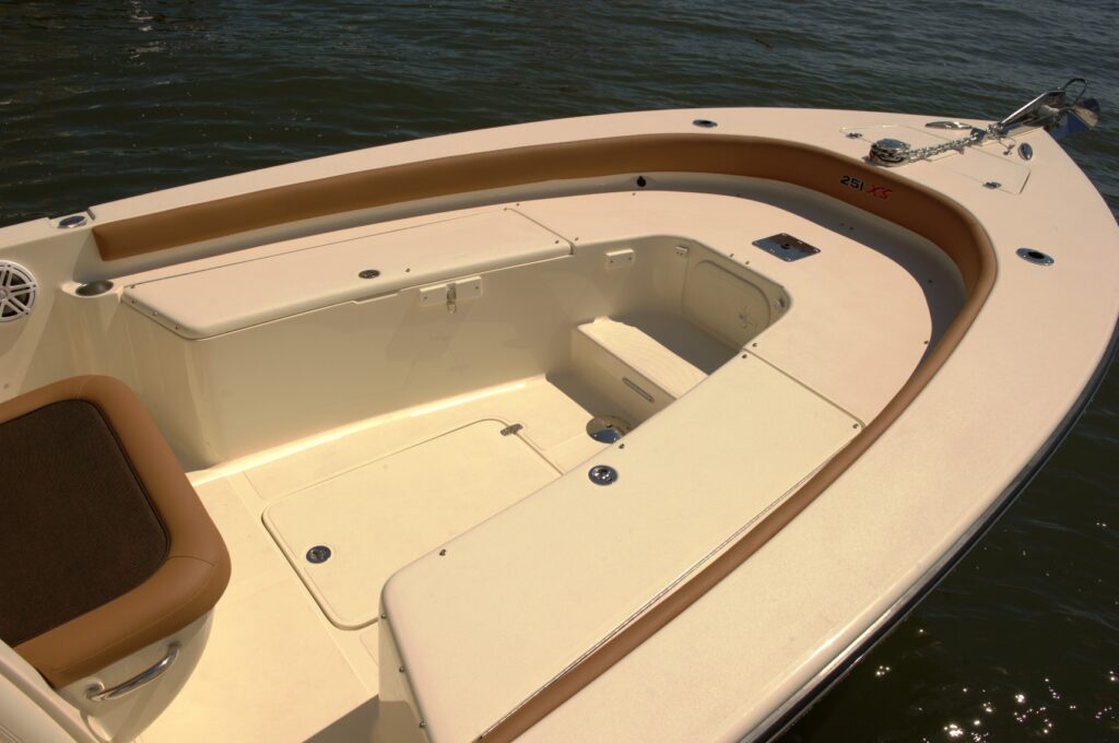 The 251 XSS, with forward seating, was designed to be a “hybrid” model capable of handling and performing in both inshore and offshore waters. This model has a draft of approximately 13” for backwater fishing; while the proud bow, hull design, depth and freeboard allow it to slice through offshore waves while keeping you dry.