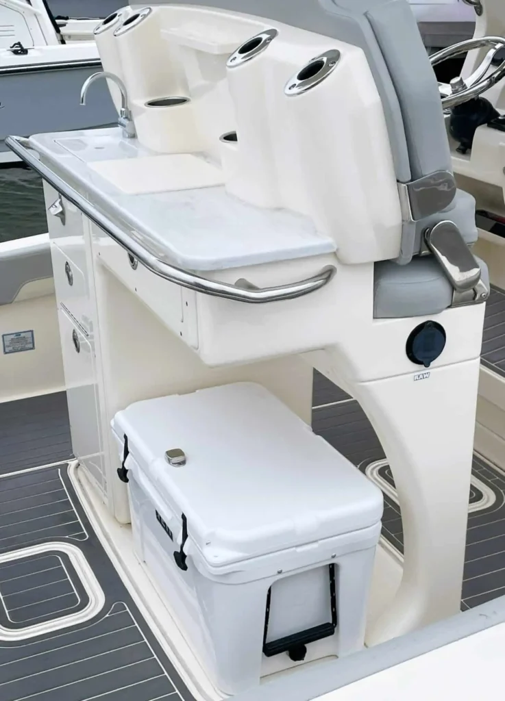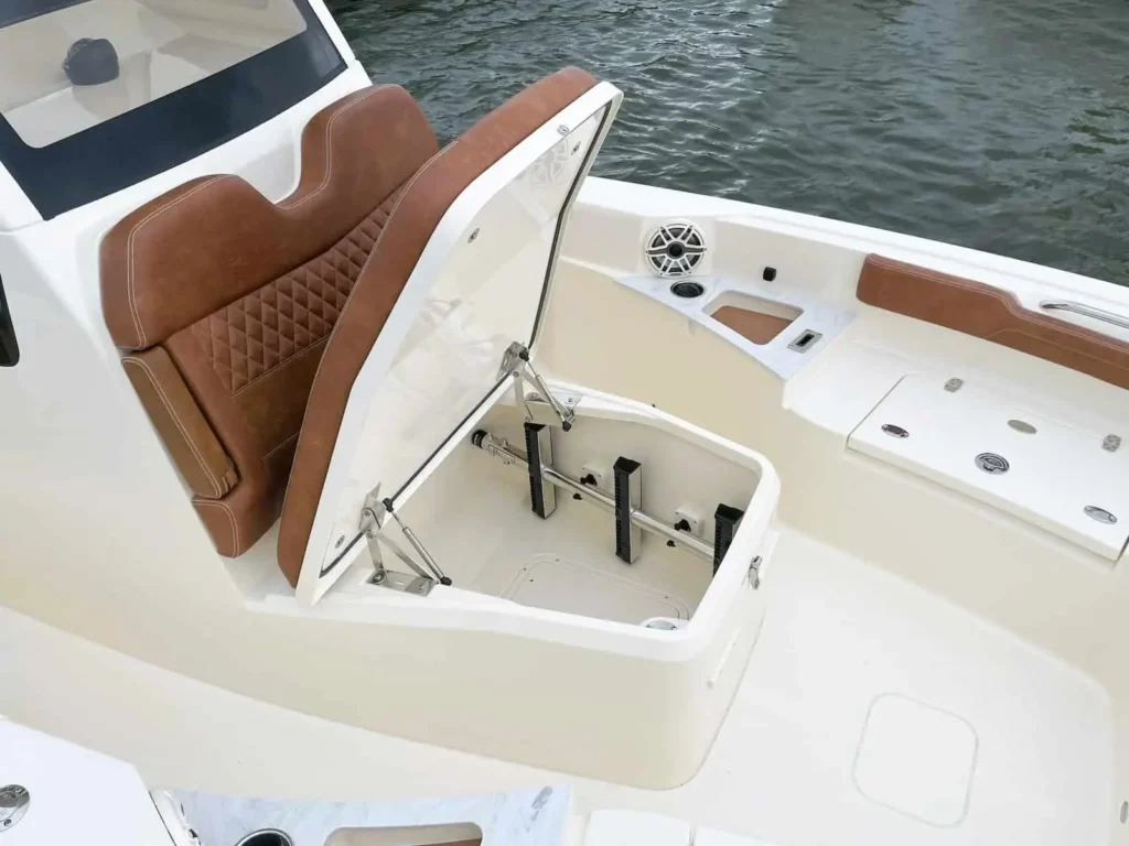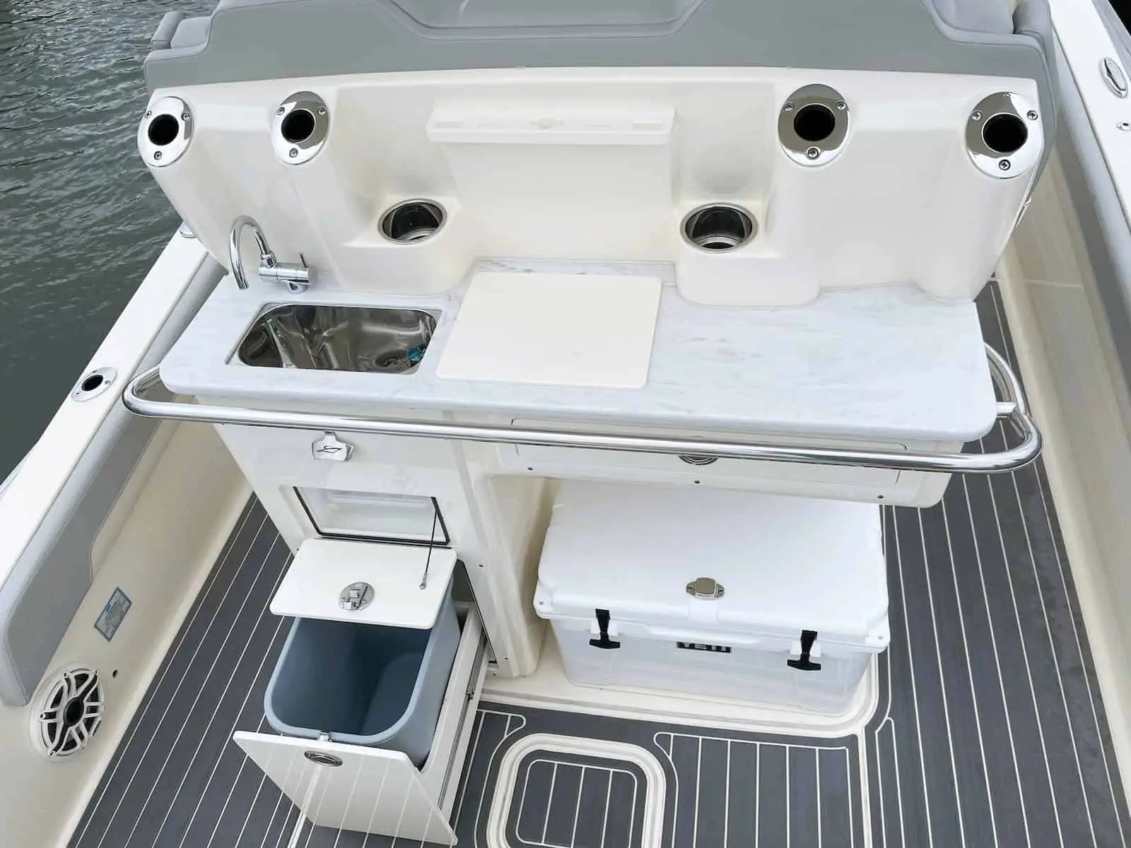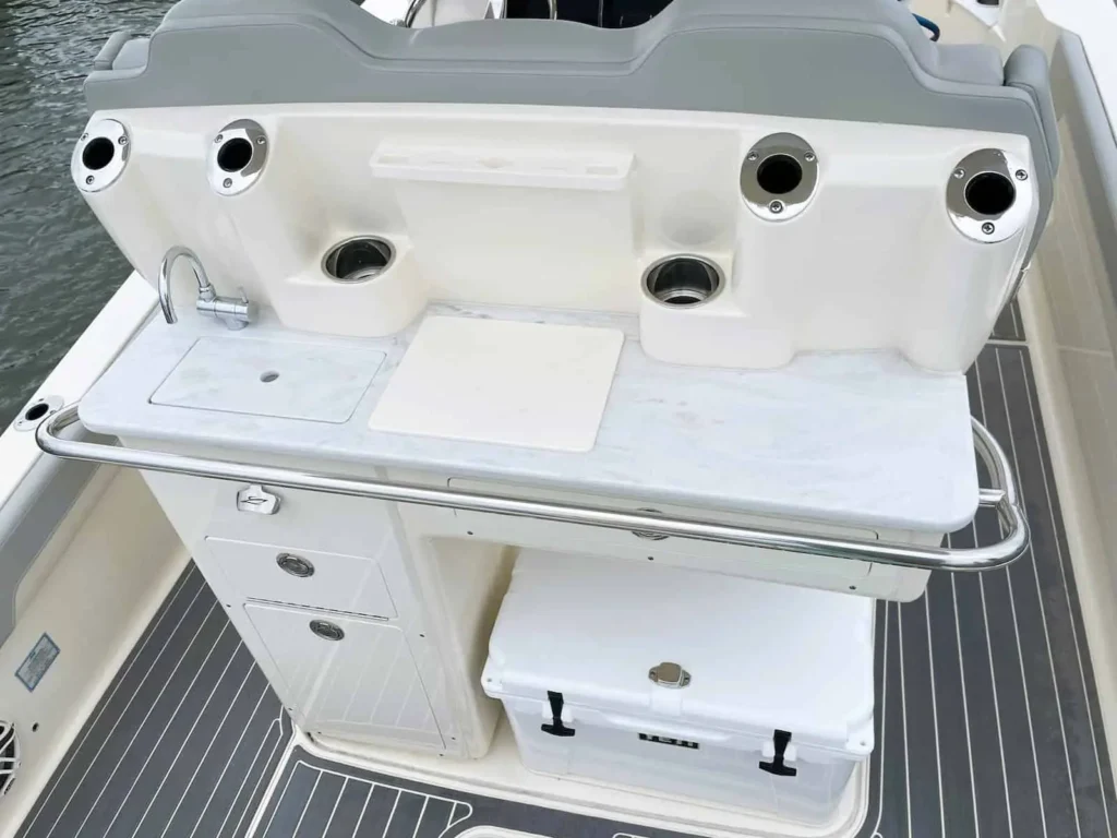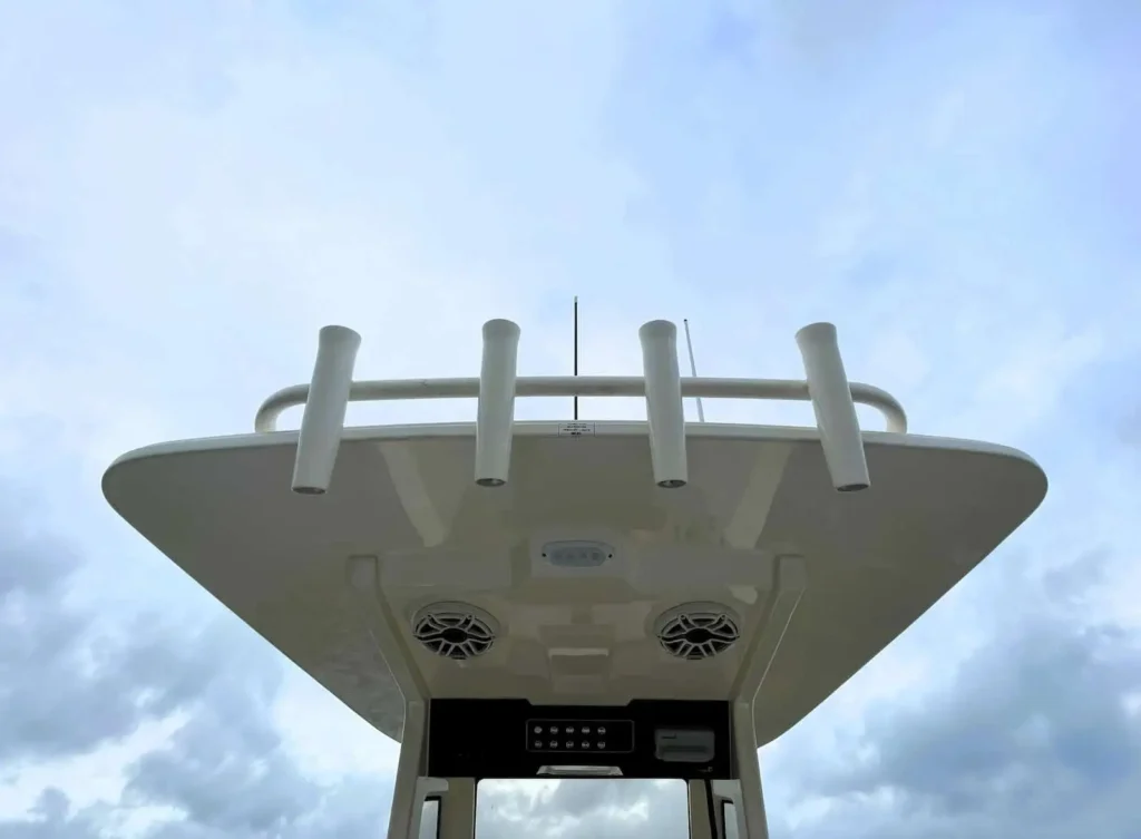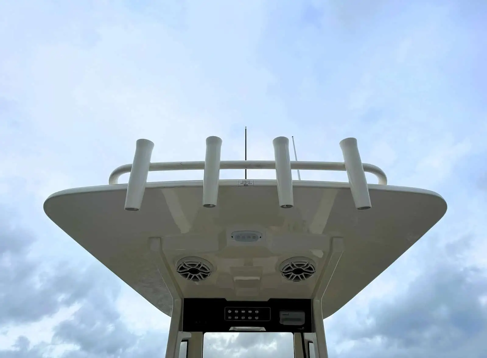 Standard features include a fiberglass hardtop w/ integrated acrylic windshields; Fusion Bluetooth stereo w/ six JL Audio speakers; and a pocket transom ladder and built-in synthetic decking step…just to name a few. Upgrade from the standard leaning post w/ cooler to the fiberglass aerated livewell leaning post w/ two helm seats w/ flip-up bolsters, trash can, tackle storage, bottle opener, rod holders and Corian countertop; as well as add on underwater lights; hardtop mounted rocket launchers; raw and fresh water wash down; outrigger, Power-Pole, and trolling motor options; and a porta-potti.