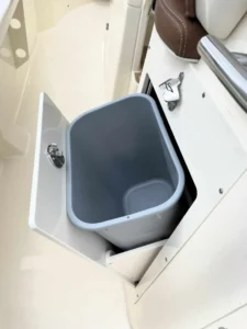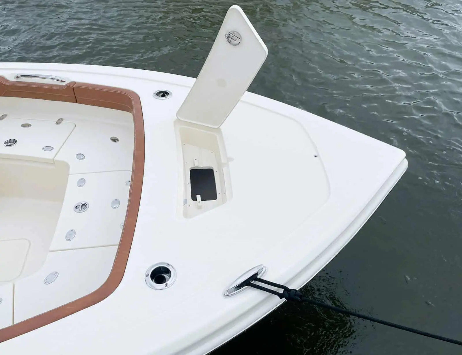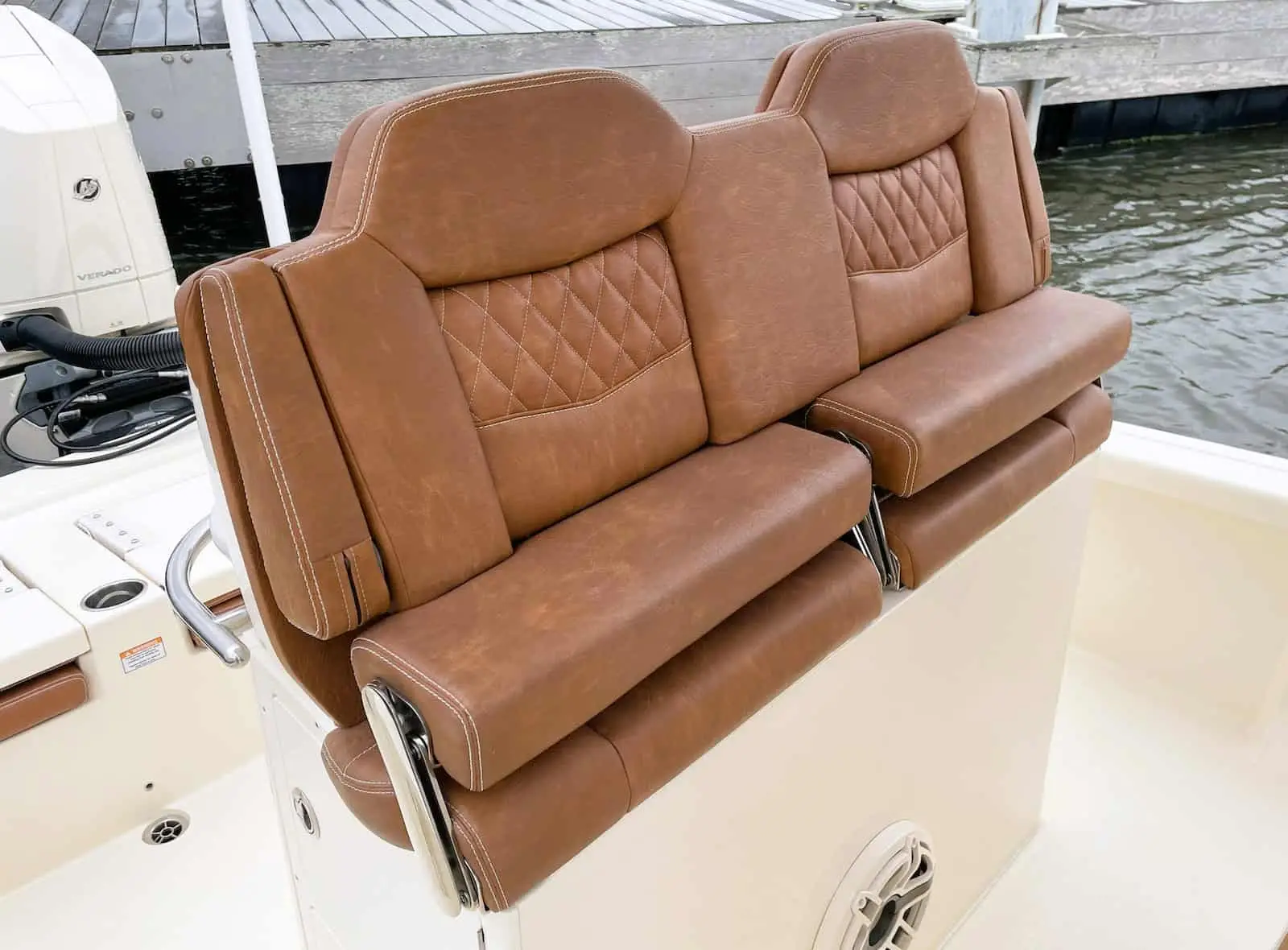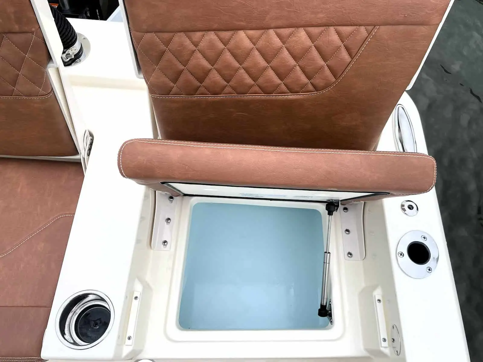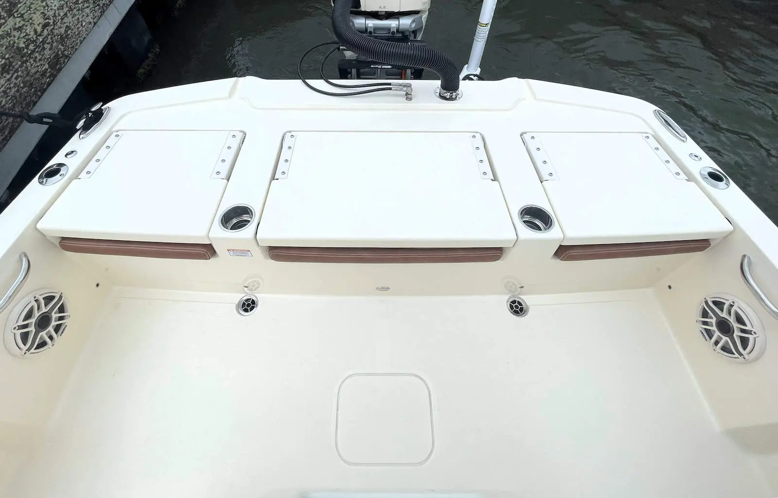 Standard features include a fiberglass hardtop w/ integrated acrylic windshields; Fusion Bluetooth stereo w/ six JL Audio speakers; and a pocket transom ladder and built-in synthetic decking step…just to name a few. Upgrade from the standard leaning post w/ cooler to the fiberglass aerated livewell leaning post w/ two helm seats w/ flip-up bolsters, trash can, tackle storage, bottle opener, rod holders and Corian countertop; as well as add on underwater lights; hardtop mounted rocket launchers; raw and fresh water wash down; outrigger, Power-Pole, and trolling motor options; and a porta-potti.