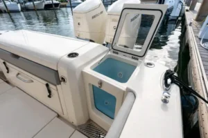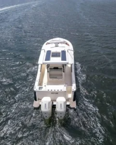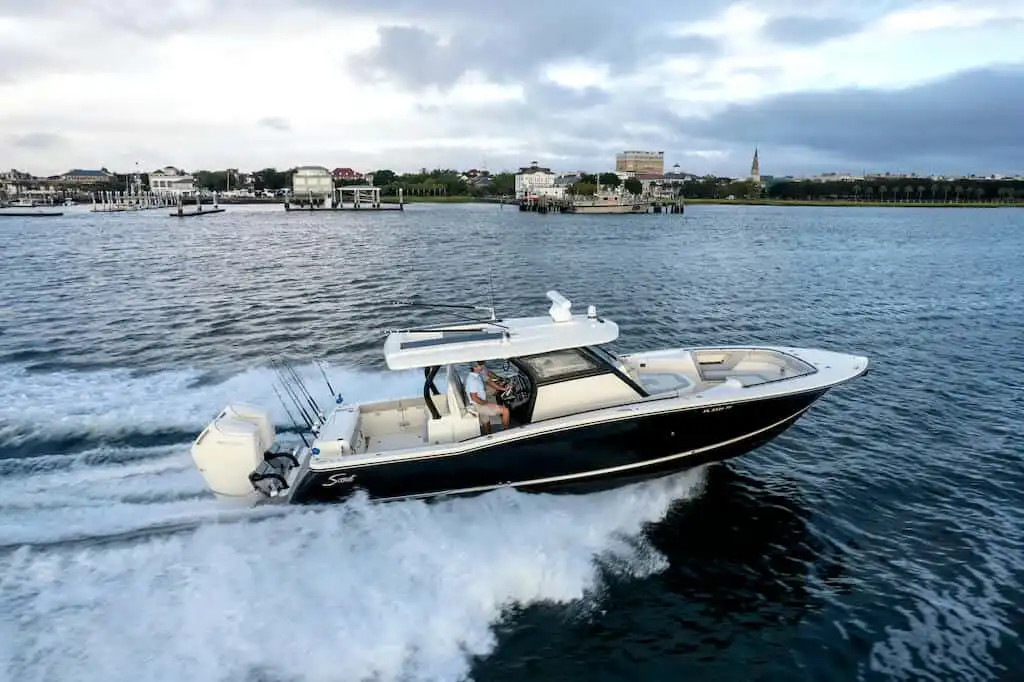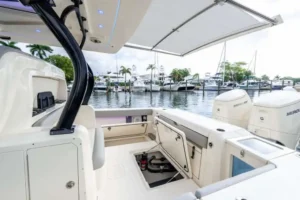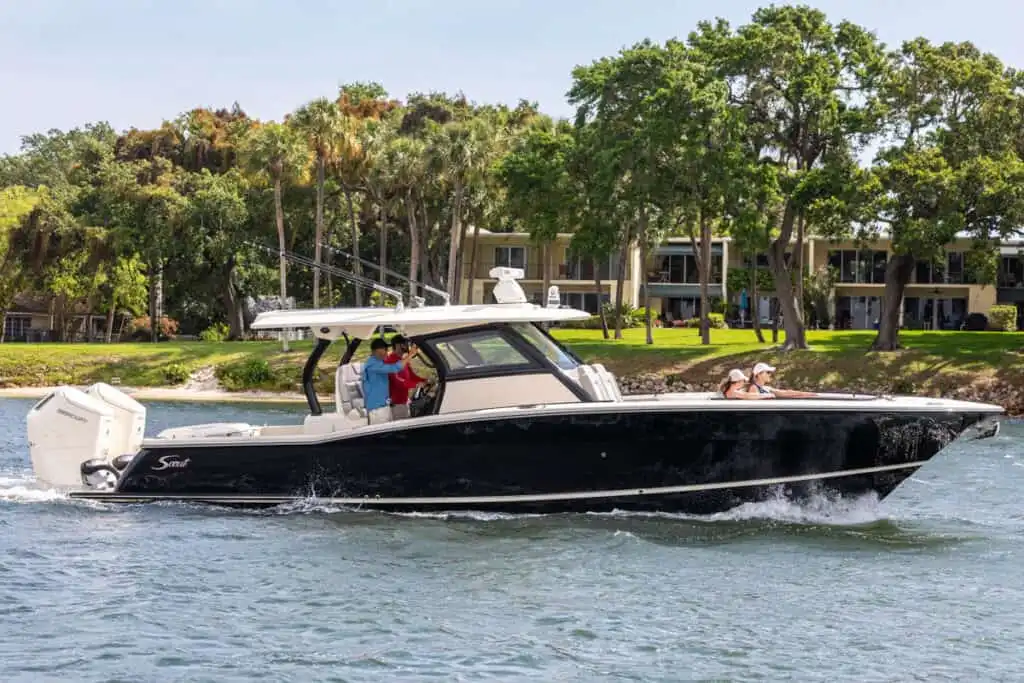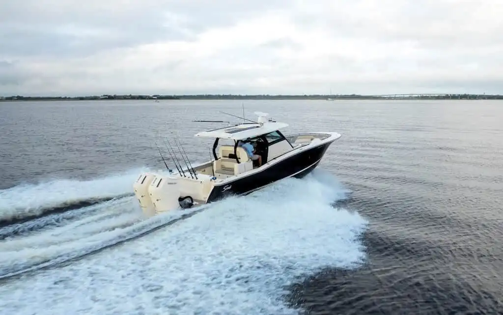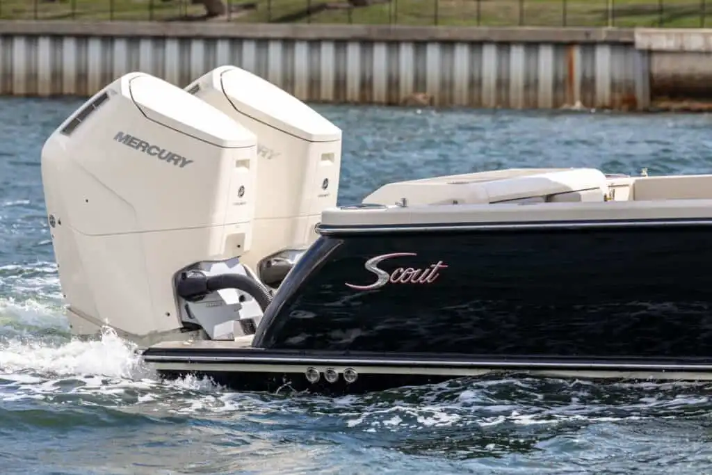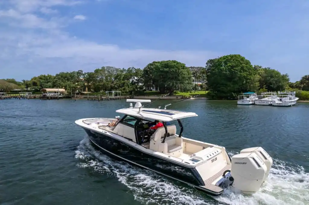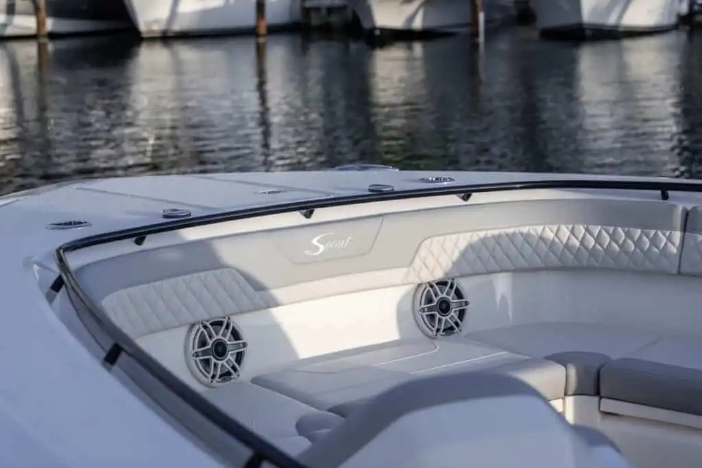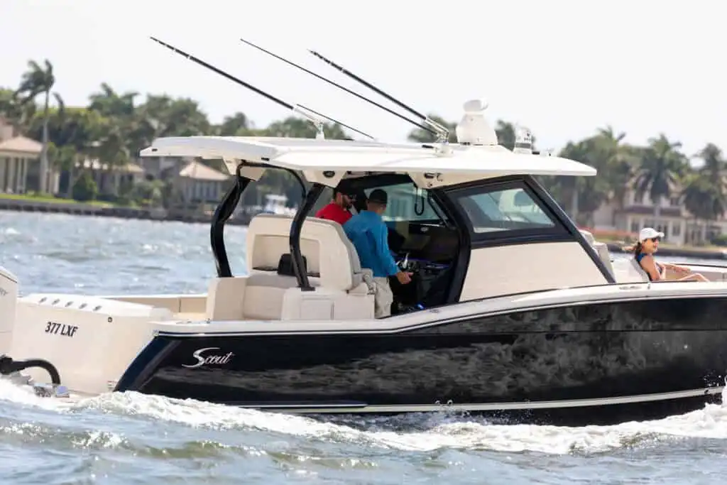 The 377 LXF is an all-new model, built as the ideal blend of performance, luxury and styling. Loaded with Scout innovation, this model has a lithium ion battery with battery management system (no generator necessary); portside swing-in boarding door with ladder; double sun deck lounge with cushions, armrests and underside storage forward of the console; key fob remote controlled lights; spacious cabin down below and an enclosed head with a porcelain vessel sink with Corian vanity and mirror; marine head with electric overboard discharge with an 11 gallon holding tank; 120V air conditioning & heat in the cabin and at the helm; and so much more. Upgrade your experience out on the water with an available Seakeeper 3 gyro stabilizer; optional summer kitchen complete with grill, sink, cutting board, manual slide-out cooler, seat cushion and bolster; and your choice of upholstery color package. Dive in to discover more.